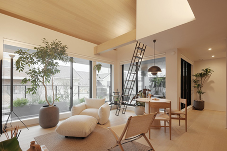 上階リビングから上を見上げると、ロフト・吹き抜けで優雅な空間を演出。