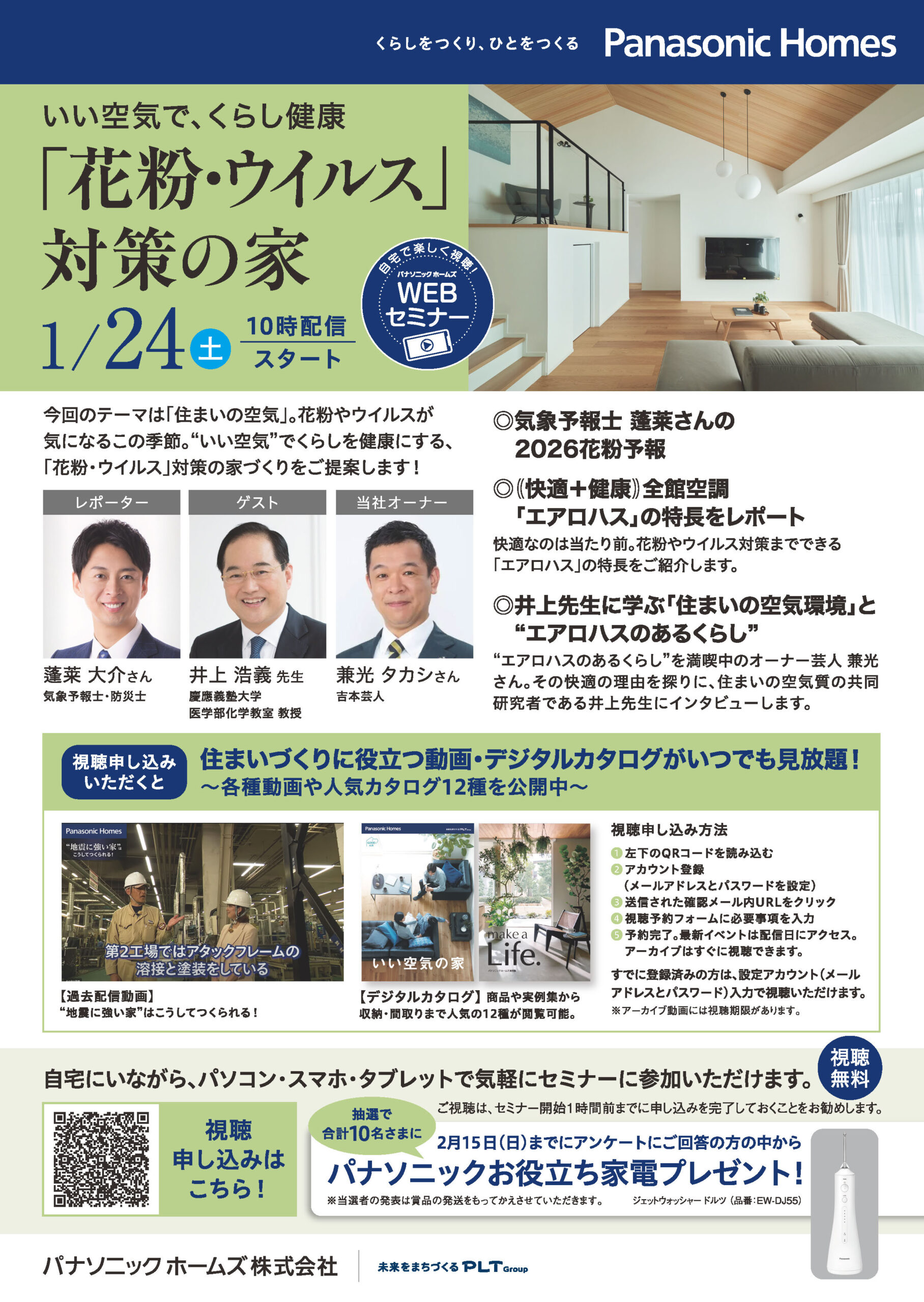 毎回ご好評のWEBセミナー、今回はこれからまたやって来る花粉とウイルスにフォーカスを当て、 パナソニックホームズの全館空調のウイルス低減効果や特徴を、専門家を交えてわかりやすくお伝えします。