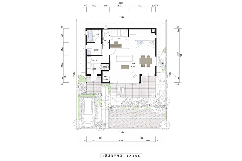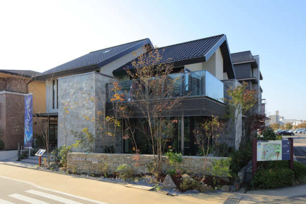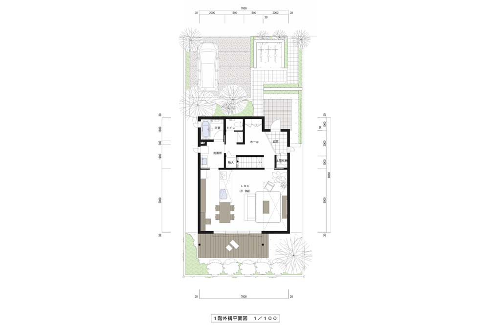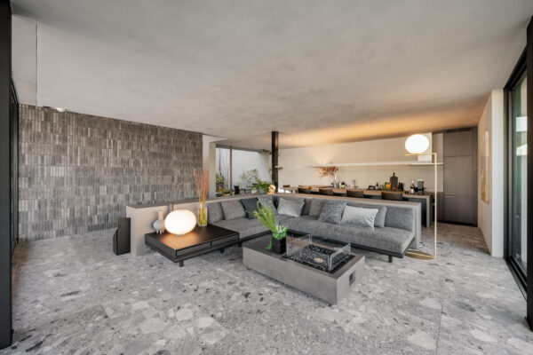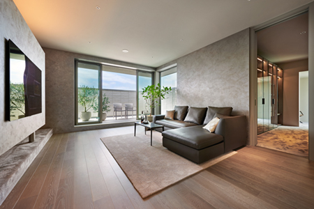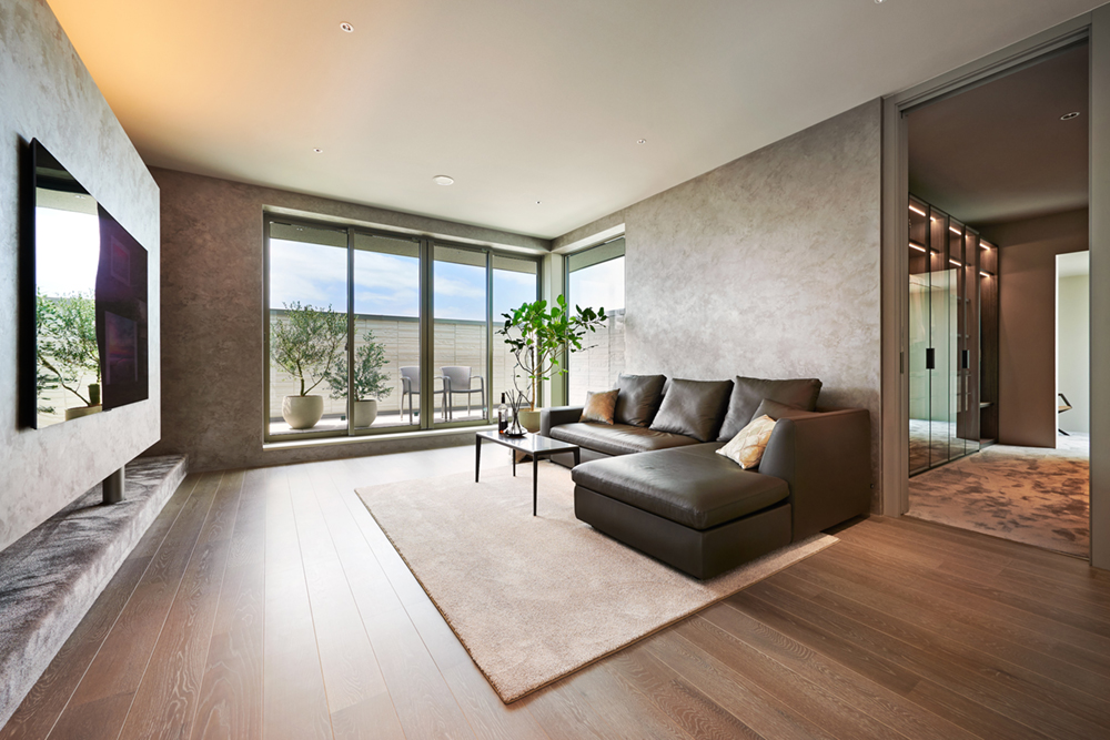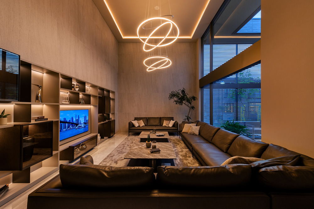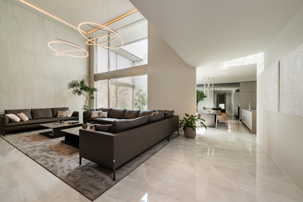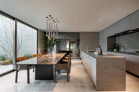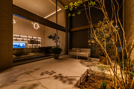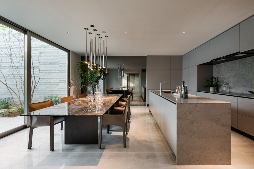 建物の外への内部の暮らしの気配を感じさせないプライバシー性の高い計画。 約22帖のダイナミックな吹抜けと大開口により、開放感と明るさを確保しています。 都市部においても周辺環境に左右されることなく、光や外を感じながら生活できる空間を実現しました。 イタリアから輸入したインテリアの数々や、素材を活かした贅沢な設えが訪れる人を魅了します。