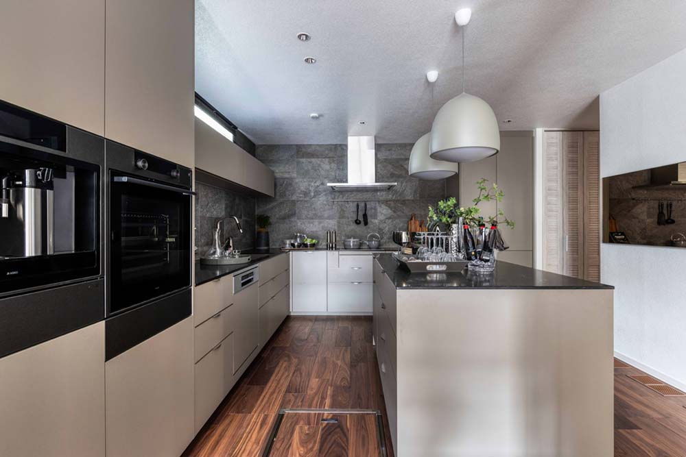 L型レイアウトとアイランドカウンターを組み合わせたキッチンは、オーブンやコーヒーマシンもビルトインされた邸宅感に溢れた仕様。