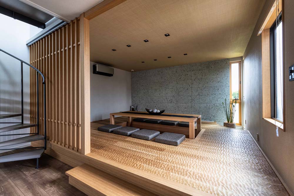 階段に面したオープンな空間の一部を、凸凹のあるナラ材の床や大谷石のアクセントウォールでジャパンディな空間に仕立てました。