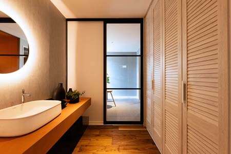 洗面室と脱衣室を分離して、来客も気軽にお通しできるパウダールームに。