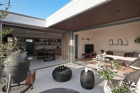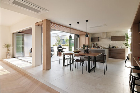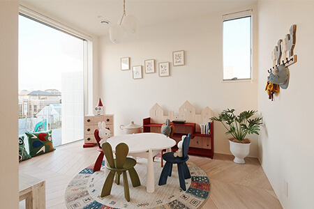 こだわりのインテリアと家の中でお子様と遊べるアウトドアリビング、天井が高く開放感のある空間など見どころをたくさん用意した展示場です。