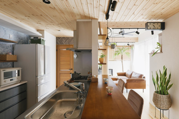 無垢の木のオープンキッチンとテーブルでカフェのような雰囲気に