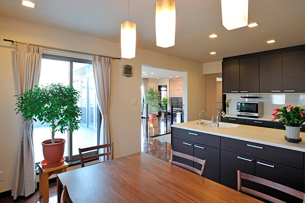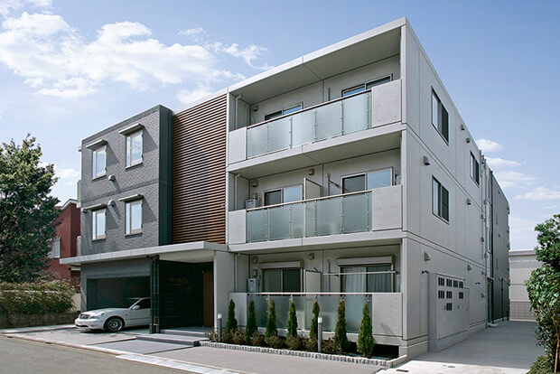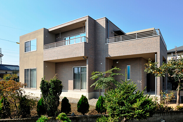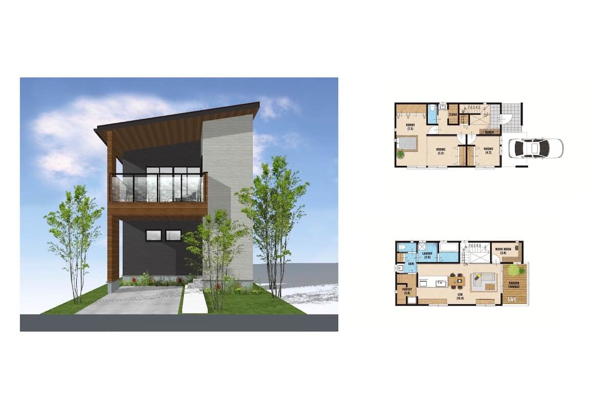 打放しデザインを中心に、重厚なタイル・全面ガラスサッシ・木調のアクセントパーツなどの異素材を配し、都市の感性を表現。またシャープなラインとボリュームのあるフォルムがコンクリート住宅「パルコン」ならではの重厚感を感じさせます。