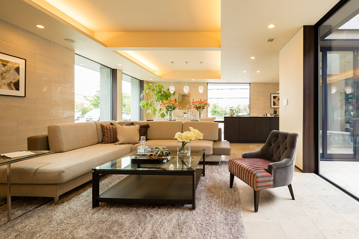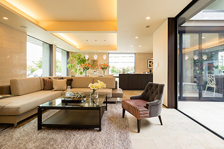 大きなFIXガラスの壁で屋外と一体空間になるリビングをつくりました。