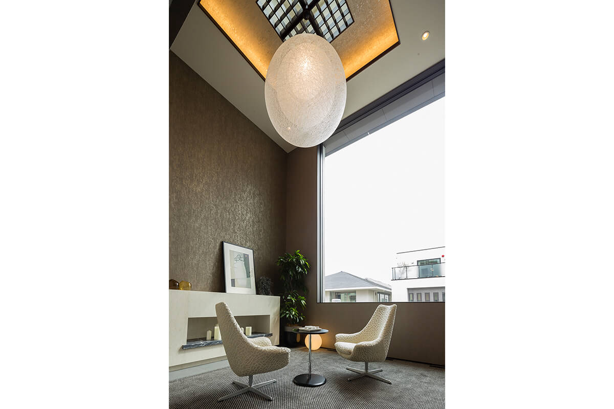 天井から釣り下がる大きなお月様の様な照明が柔らかな光で空間を照らします。