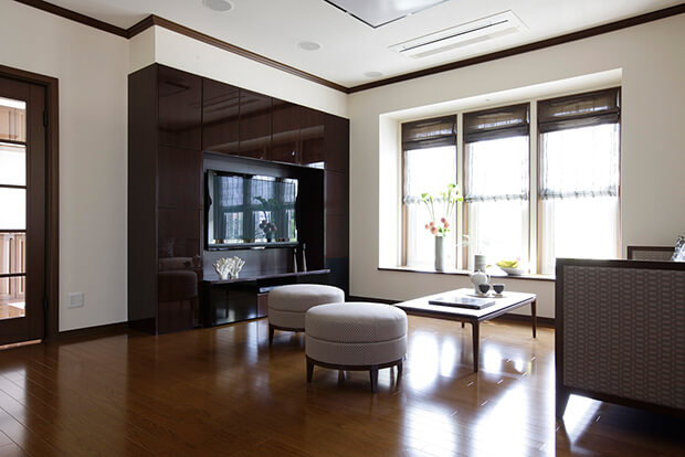 大きな出窓と光沢のあるTVボードを設えた上質なリビング