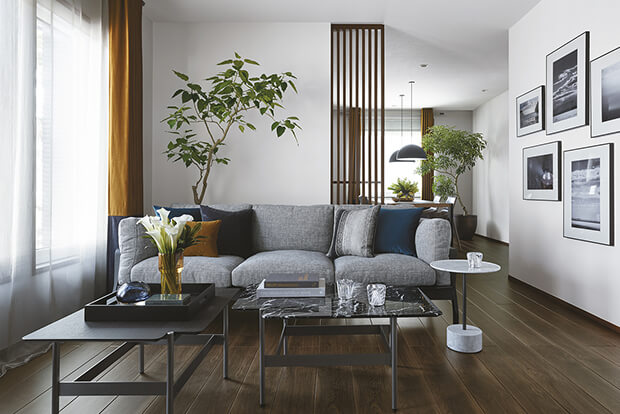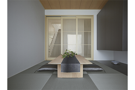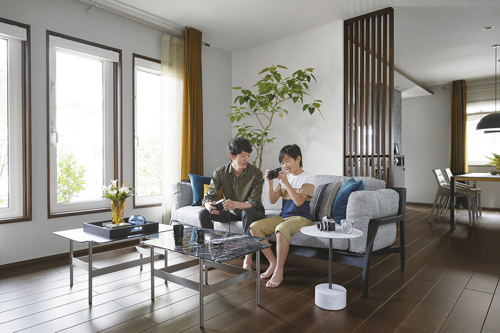 木調ルーバーで空間をソフトに仕切った居心地のよいリビング