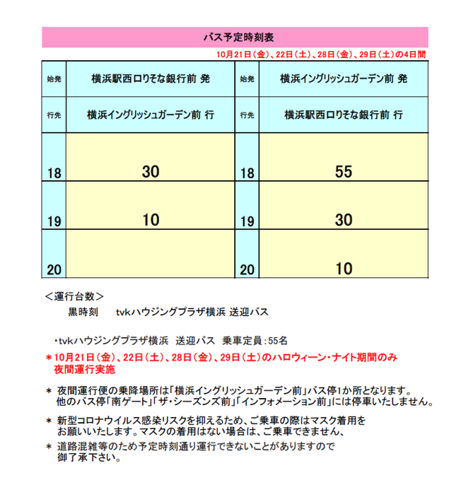 横浜イングリッシュガーデンにおいて10月21日(金)、22日(土)、28日(金)、29日(土)に開催致しますハロウィーン・ナイト期間のみ無料送迎バスの夜間運行を行います。tvk ecom park にお越し頂いているご来場者様もご利用できますが、当日は混雑することが予想され定員となった際にはご乗車頂けない場合もございますので予めご了承ください。